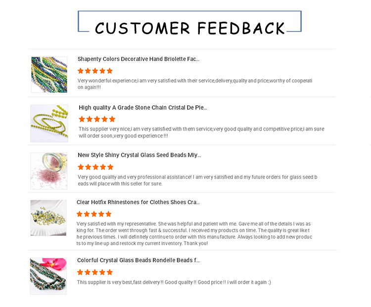 A: We have more than 6 years of raw material production experience and more than 10 years of export experience. We have a wide variety of colors and designs, for rhinestone trimming, we have more than 80 plastic colors and 100 designs; for DIY handmade collections, we have more than 500 designs and 100 colors for each design. What's more, we can customize the colors and designs that customers need. In addition, we always focus on new model design and quality control, so we have earned a global reputation, you can see our factory scale and comprehensive capabilities on our website.