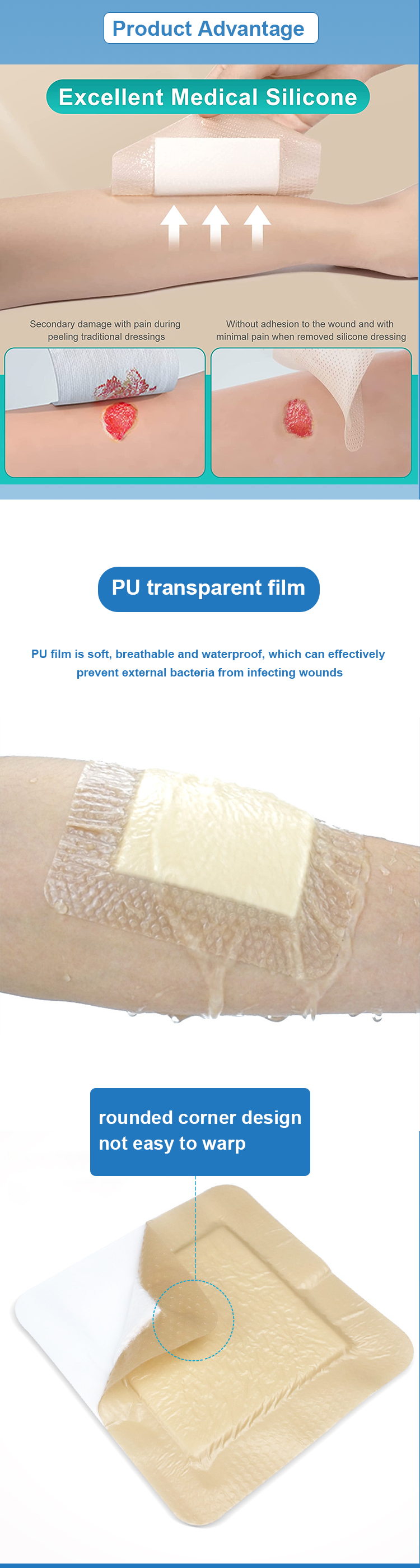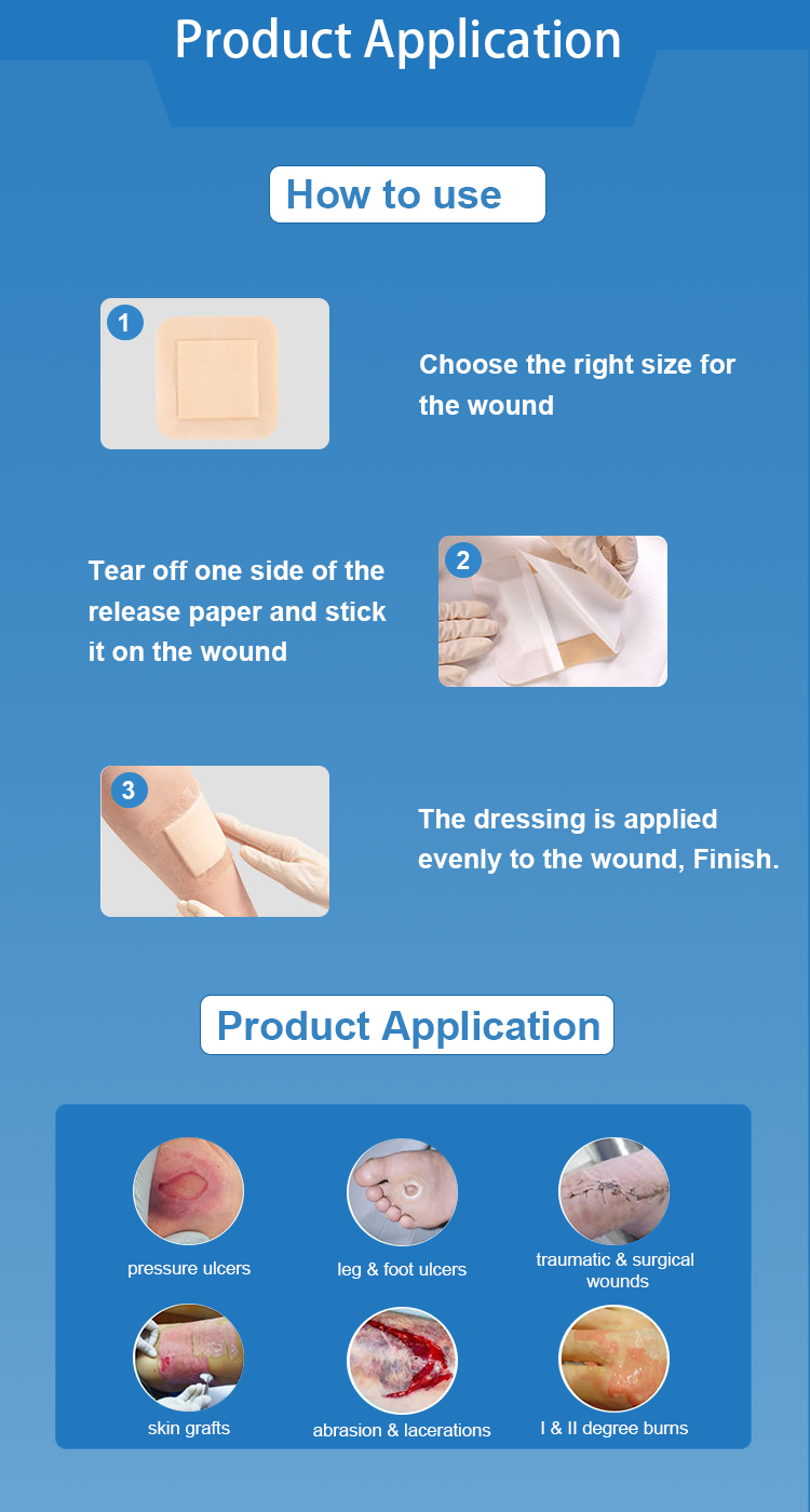 | 1. Reduce pain and trauma during dressing changes and improve patient comfort. 2. Fast and effective absorption, reducing the risk of skin maceration. 3. Highly breathable, waterproof and bacteria-barrier top back membrane maintains a moist and healthy healing environment. 4. The self-adhesive ready-to-use dressing conforms to the contours of the body and can be easily applied to hard-to-wear areas. |
