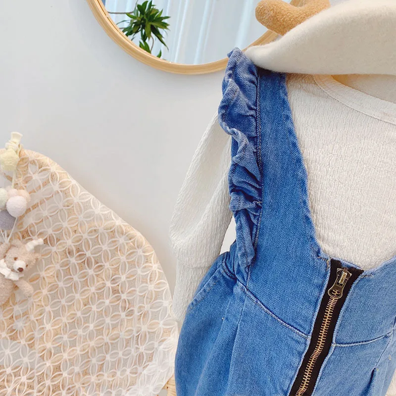 2021 New Cute Baby Girl Denim Jumper Jeans Stylish Toddler Girl One Piece Ruffle Zipper Jeans 1-6 Years