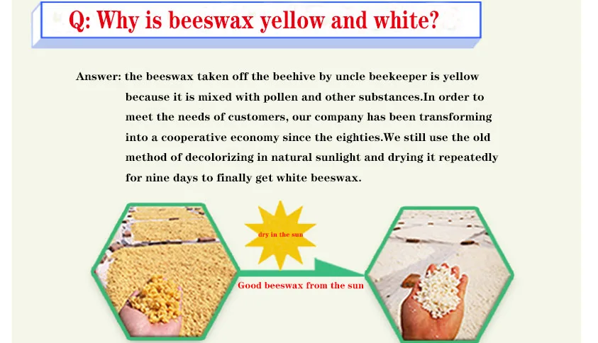 | Payment Terms: | L/C,Western Union,D/P,D/A,T/T,MoneyGram; | Purification of beeswax: | First melt and then purify; |