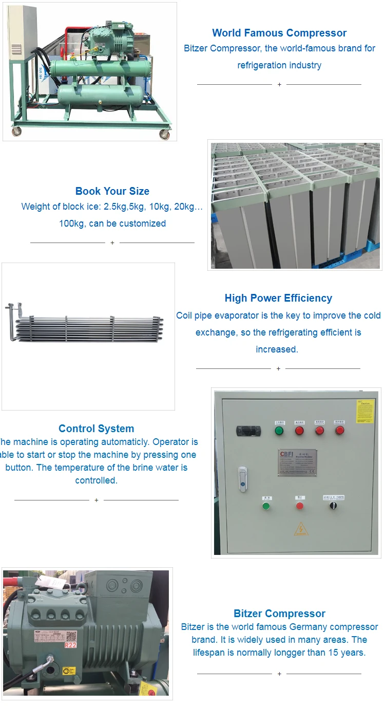 The block ice machine is an ice maker that produces the largest ice cubes in artificial ice cubes with the smallest contact surface and is the most difficult to melt. It is widely used in docks, ice-making plants for food processing and preservation, aquatic product preservation, cooling, ice sculpture shaping, edible ice manufacturing. The size of the ice cubes can be customized and they can be shredded into different shapes.