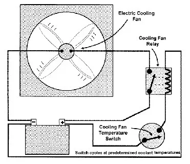 A fan motor is switched on when the radiator's coolant temperature has risen to about 195 to 210 degrees. The engine willmalfunction at this heat level, so the fan motor activates the blades and keeps them turning to help lower the temperature.