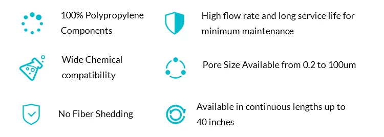BGE Series are all-polypropylene filter cartridges with an economically efficient design which is suitable for a wide range of process applications .The pleated polypropylene filter material provides a large filtration surface area which allows for maximized flow rate in the system.Available in nominal retention ratings from 0.1 to 50 micron.