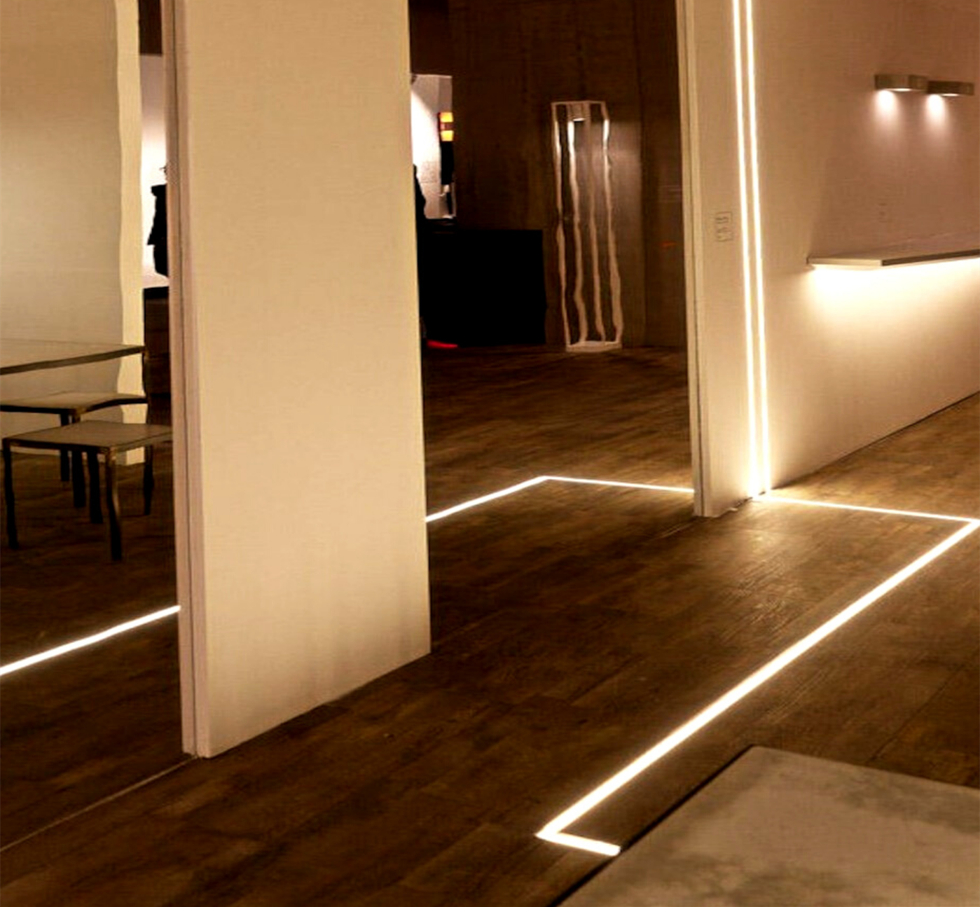 It consists of aluminum channels embedded in plasterboard and accommodates LED strips for indirect lighting