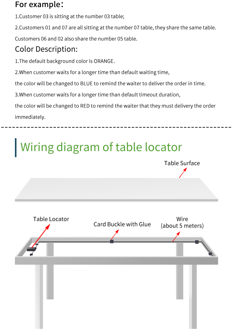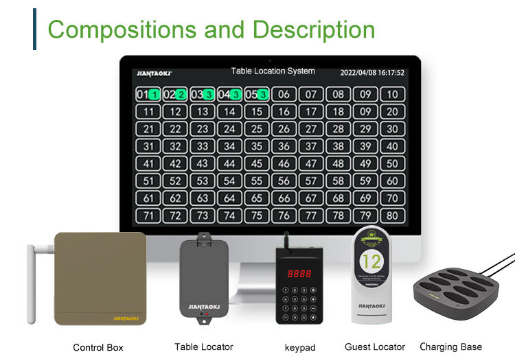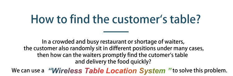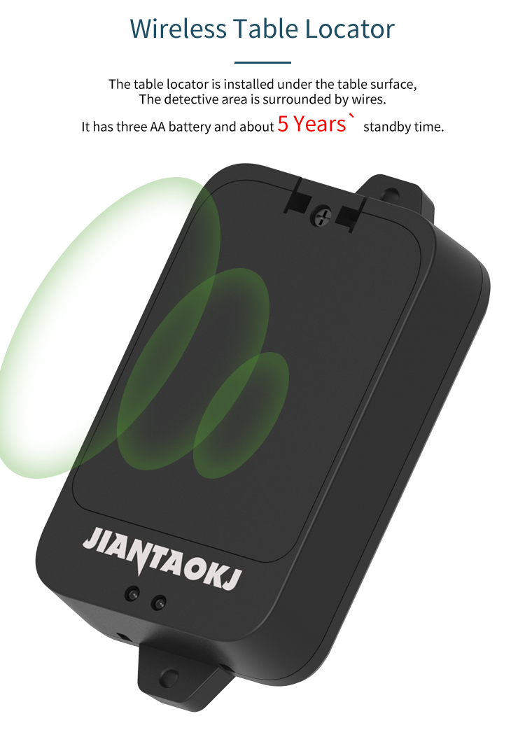 Used to receive and send the table where the customer is. The cashier will hand over to the customer after ordering and paying. ——Model: JT-951 ——Material: ABS ——Size: 135x58x23mm ——Battery: 300mAh rechargeable lithium battery ——Standby time: about 6 days ——Positioning method: Active RFID ——Frequency: 433MHz Description: Please Place on a tabletop surrounded by wires.
