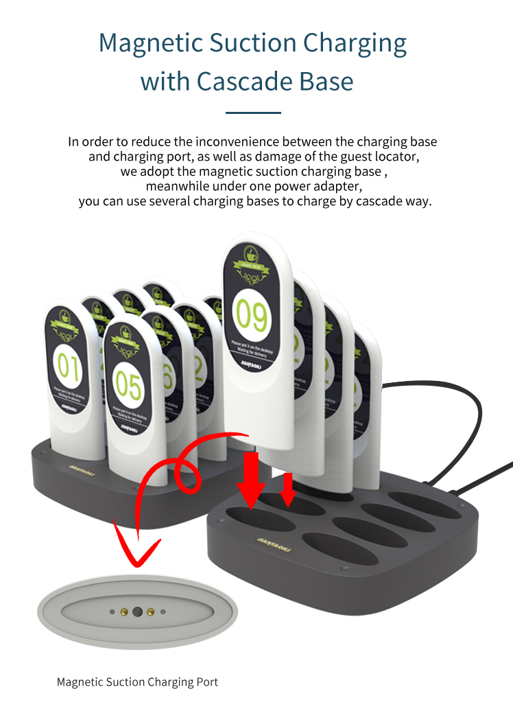 It is used to charge the visitor locator. ——Dimensions of charging base: 155x155x27mm ——Power supply: DC 5V2A ——Charging method: magnetic suction (can be cascaded) ——Charging slots: 8 Note: Please put the visitor locator on the charging base and turn on the power,The red charging indicator light is on when charging, and the green charging indicator light is on when fully charged. The charging bases can be cascaded with each other through a power adapter.