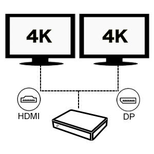 Both HDMI and DP support 4K output. When you connect two monitors with your computer, it transfers visual images on both screens.