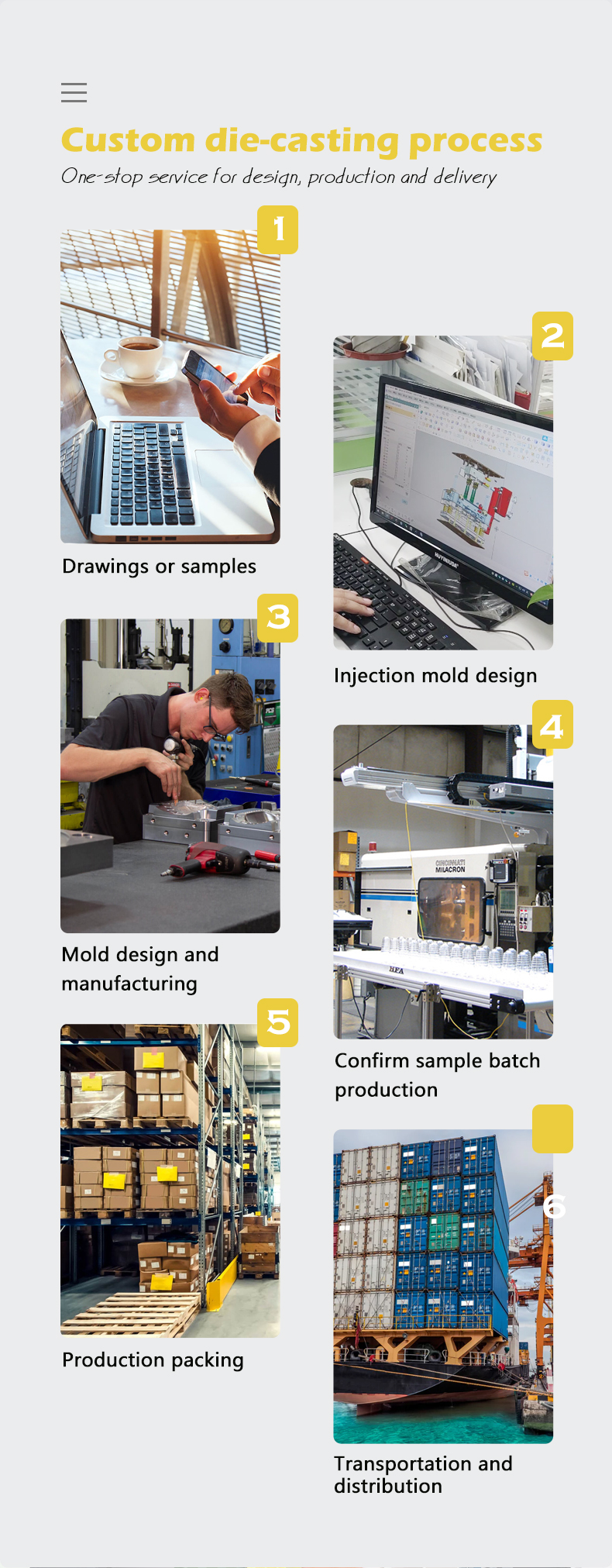 We also welcome OEM and ODM orders, our project engineers can provide the following services, from project management, structural design technology to mold design, molding process control, die casting, etc. Whether selecting a current product from our catalog or seeking engineering assistance for your application, you can talk to our customer service center about your sourcing requirements, you are welcome to visit our factory and establish a cooperative relationship.