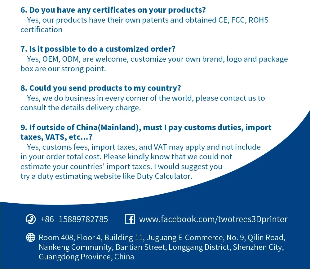 ShenZhen TwoTrees Technology Co.,Ltd is a one-stop service provider for 3D print production, R&D, sales, accessories and 3D print-related derivatives.we focus on research and develop new technology to create new products.Provide efficient and affordable 3D printing solutions for individuals, families, education and enterprises.Meet each customer's requirements for efficiency, quality and rapid prototyping.