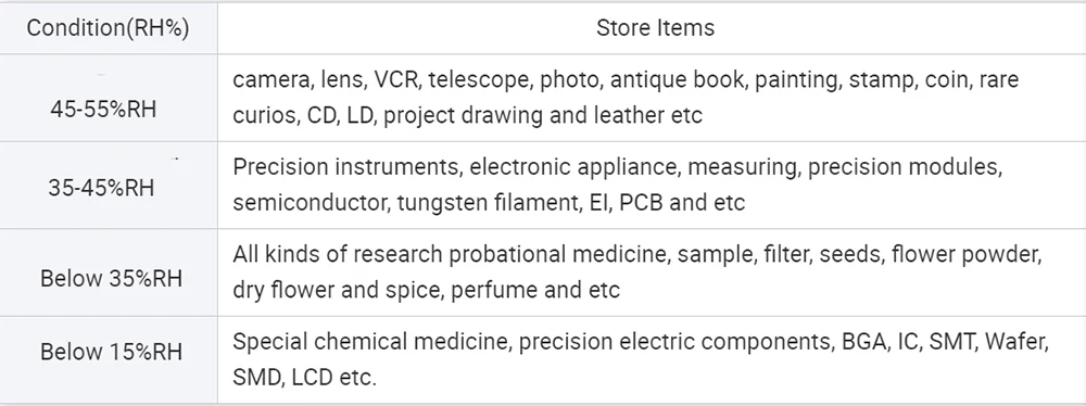 Recommended RH value for various articles storage