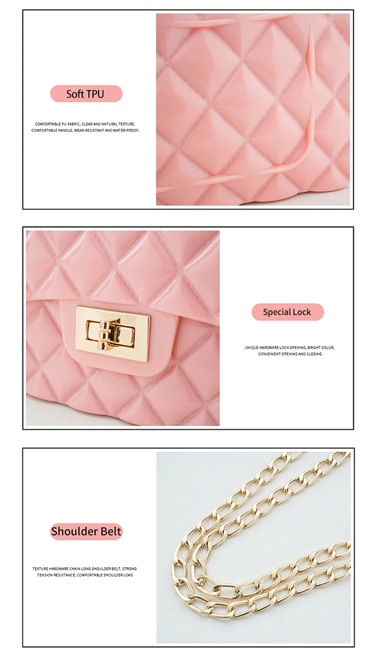 Detail pictures of 2021 new fashion candy jelly handbag crossbody jelly hand bags with chain for girl women
