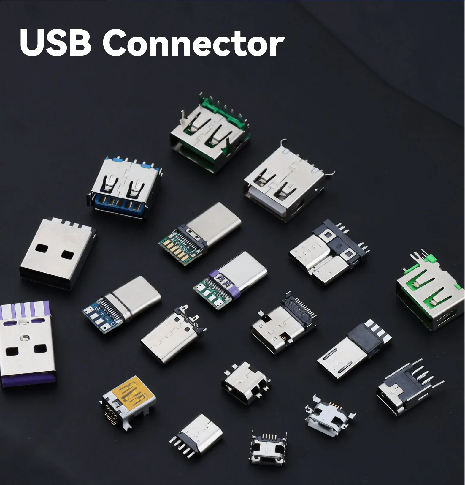 USB CONNECTOR is an accessory that can be used on a PCB board,there are four types, respectively:MICRO、TYPE-C、TYPE-A、TYPE-B