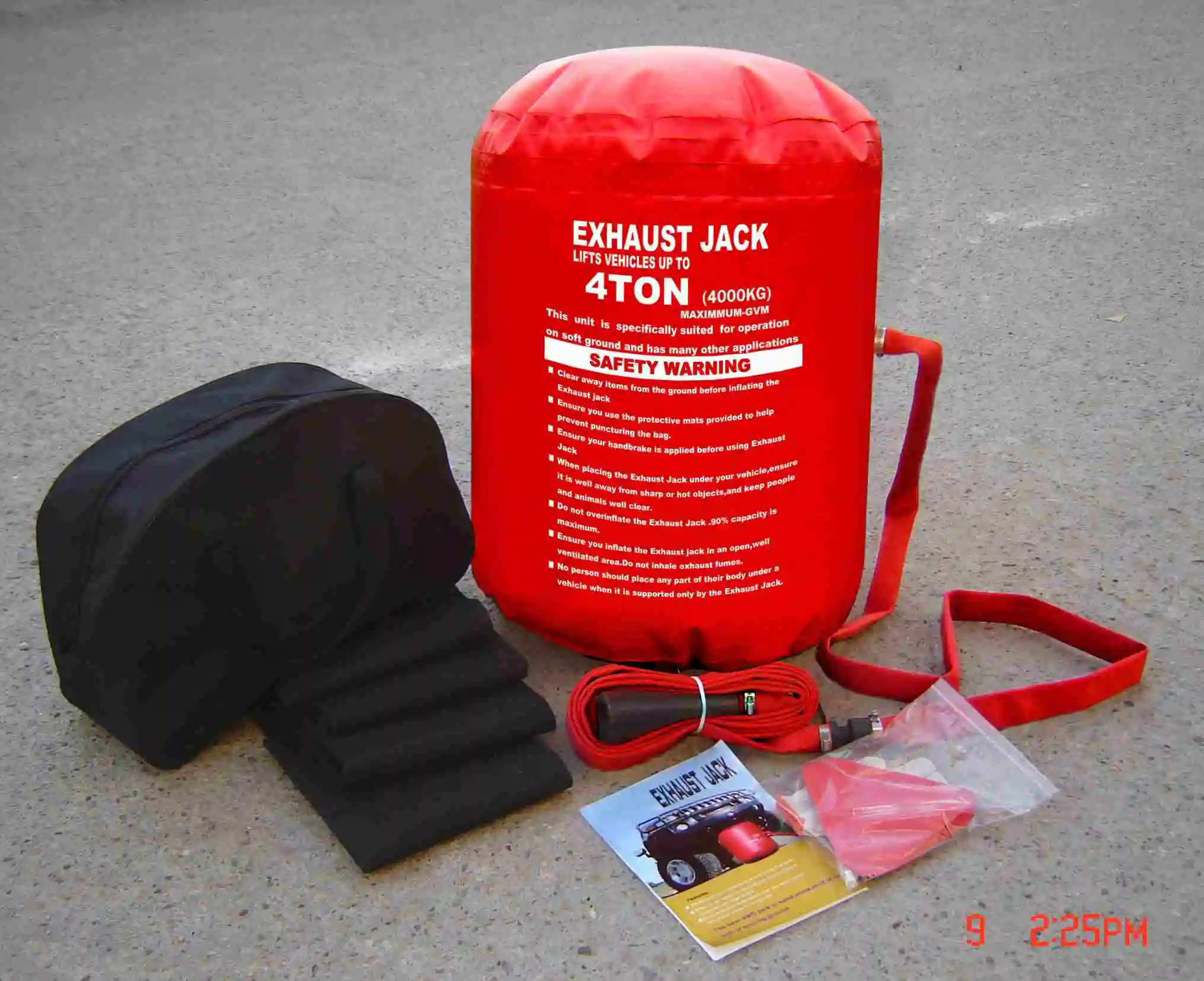 Air jack use the vehicle’s own exhaust to inflate the jack body, is capable of lifting vehicle out of ruts or holes.