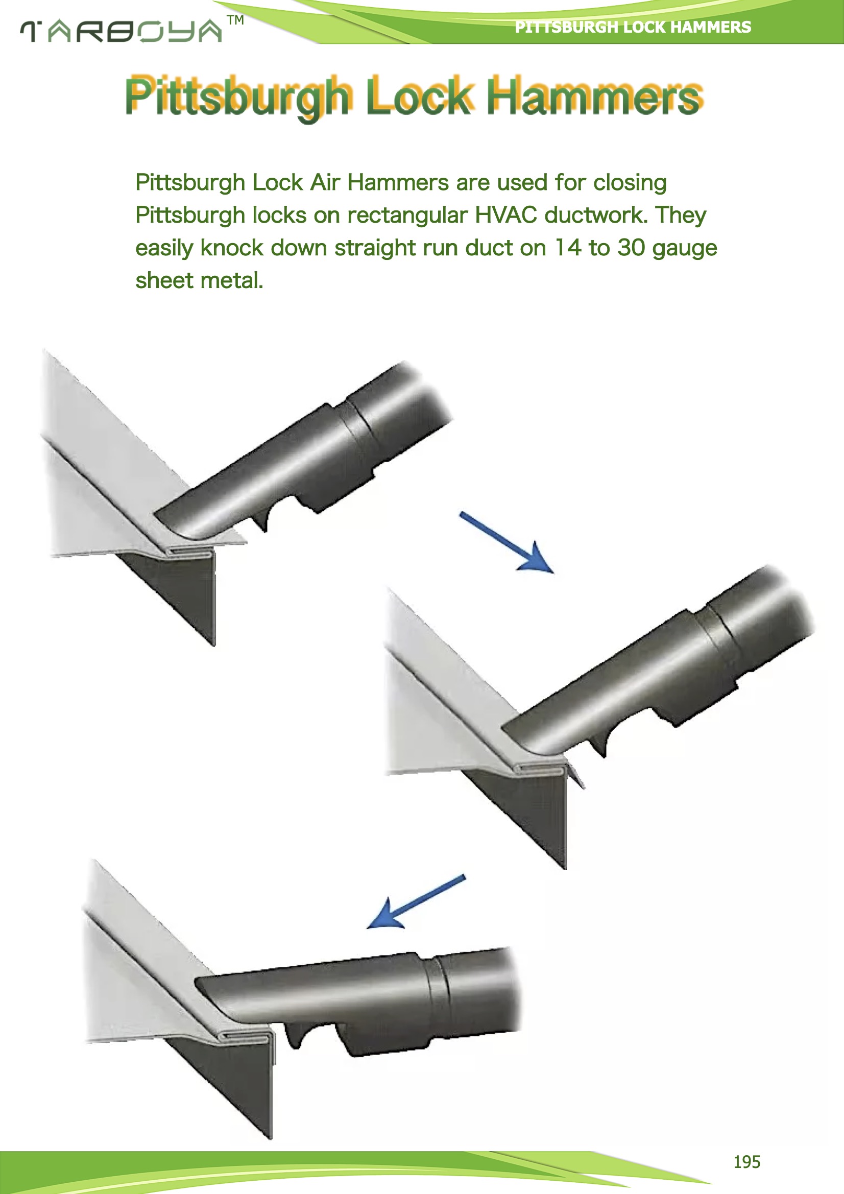 This is the Pittsburgh Lockstitch Air Hammer that will cut your finish time by 80%. They can be used in general fabrication to fold or "seam" metal to 16 gauge (17 SWG) or lighter, to run Pittsburgh lock seams on ductwork, pipes, doors, panels,HVAC duct manufacturing,etc. Operators require no special training or skills. The finished seams are neater and more even than hand-hammered seams. Manufacturers using adapters claim that one operator's output is equivalent to that of eight hand-hammering workers.