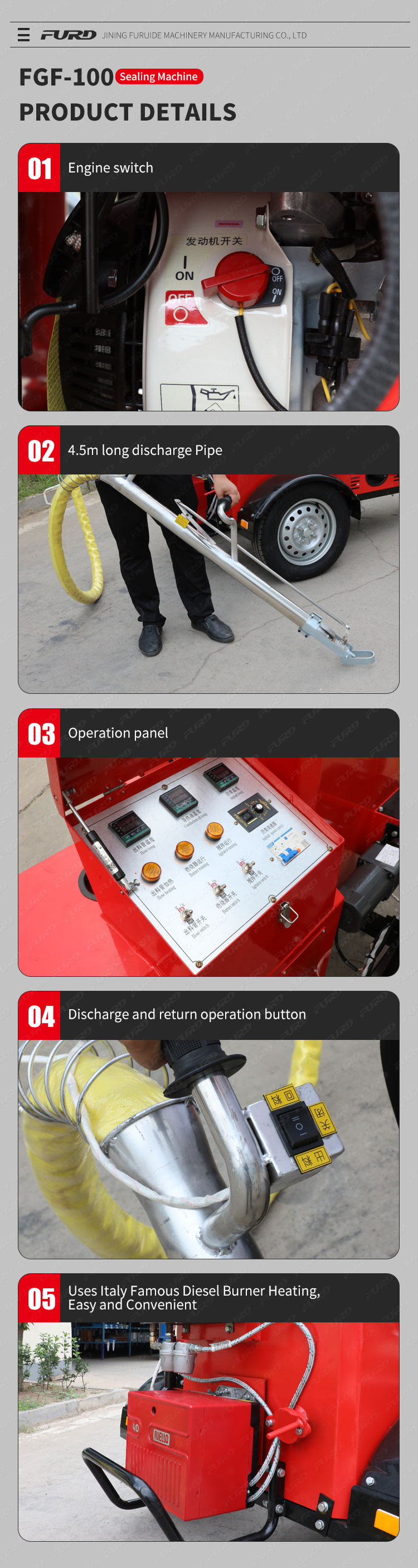 FGF-100 Pothole Repair Machine adopts Italian Riaro diesel engine, mainly used for pothole repair and irregular crack waterproof treatment of asphalt pavement, airstrip, concrete pavement, bridge expansion joints, sewers, gas pipeline burial and road paving.
