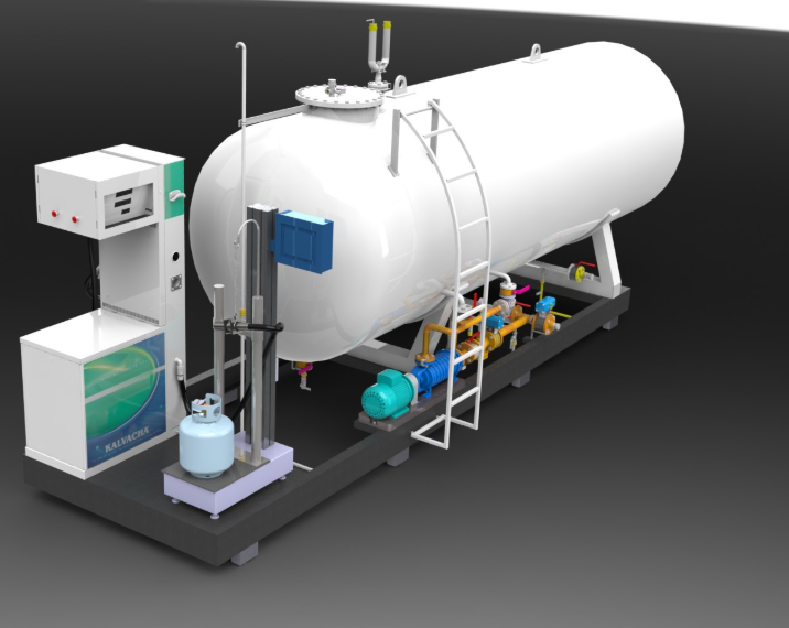 Independent LPG storage device, pumping equipment and distributor are integrated in the frame.