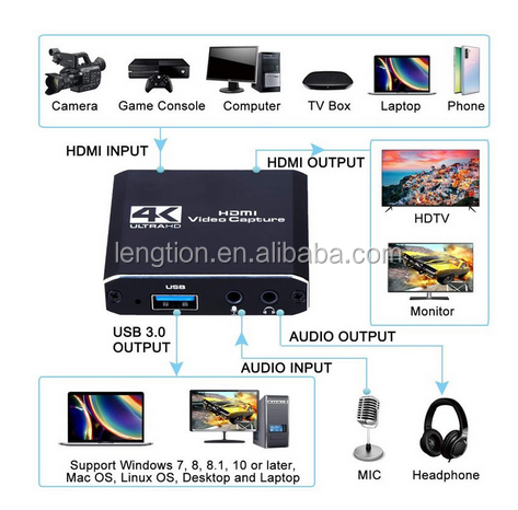 * Support maximum input resolution 4K/30HZ; * Support maximum output resolution up to 1080P/60Hz; * Support 8/10/12 bit color depth; * When using a standard AWG26 cable, the input transmission distance can reach 15 meters (1080P and below resolution); * Support most capture software, such as VLC, OBS, Amcap, etc.; * Support Windows, Android and MacOS; * Comply with USB video UVC specification; * Comply with USB audio UAC specification; * No external power supply, compact and convenient carry.