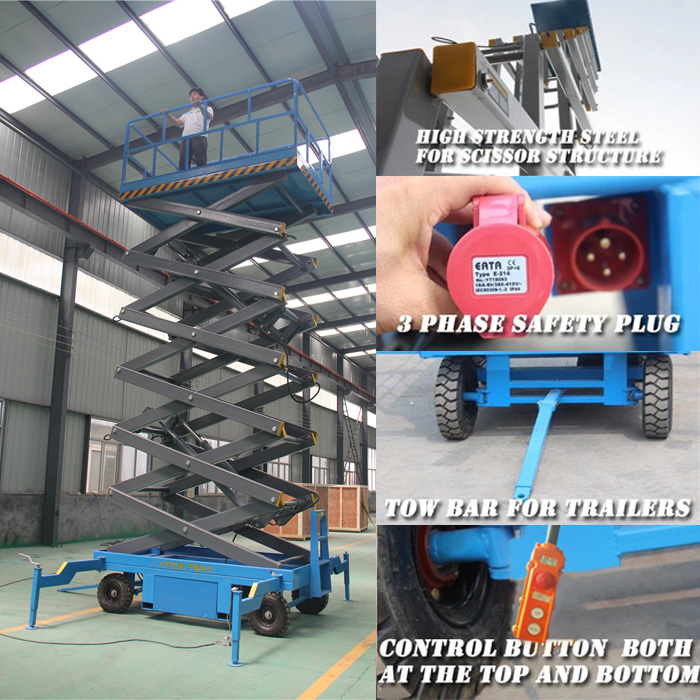 Lifting tables are mainly used to lift workers to high places for repair, maintenance, cleaning or installation. You can easily move it to the correct working area. Mobile scissor lifts can also be equipped with batteries. With batteries, you don't need to connect to AC power, and you can make the mobile scissors lift and lower in some work areas without power. In addition, this mobile scissor lift can be installed with driven wheels and moved by hand without any hardness.