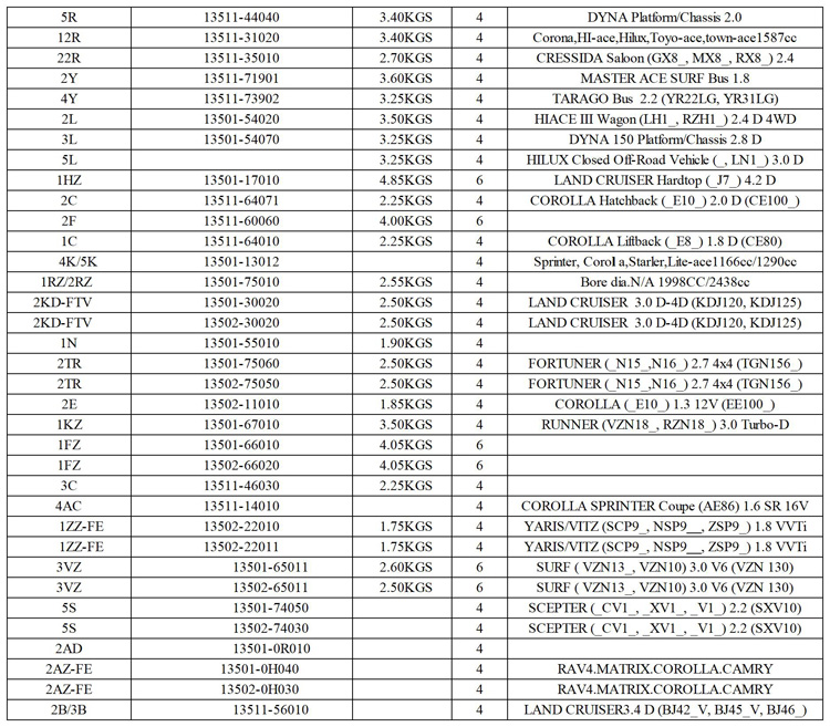 | Car manufacturer | TOYOTA MODEL F HILUX PICKUP 2.2 4WD LITEACE BUS 2.2 4Y |