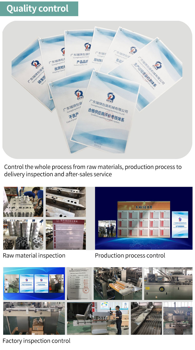 Guangdong Rich Packing Machinery Co., Ltd. has a history of 27 years experience in manufacturing pharmaceutical machinery and packing machinery. Our main products including automatic capsule filling machine, tablet press machine, electronic counting machine, blister packing machine, and cartoning box packing machine, etc.