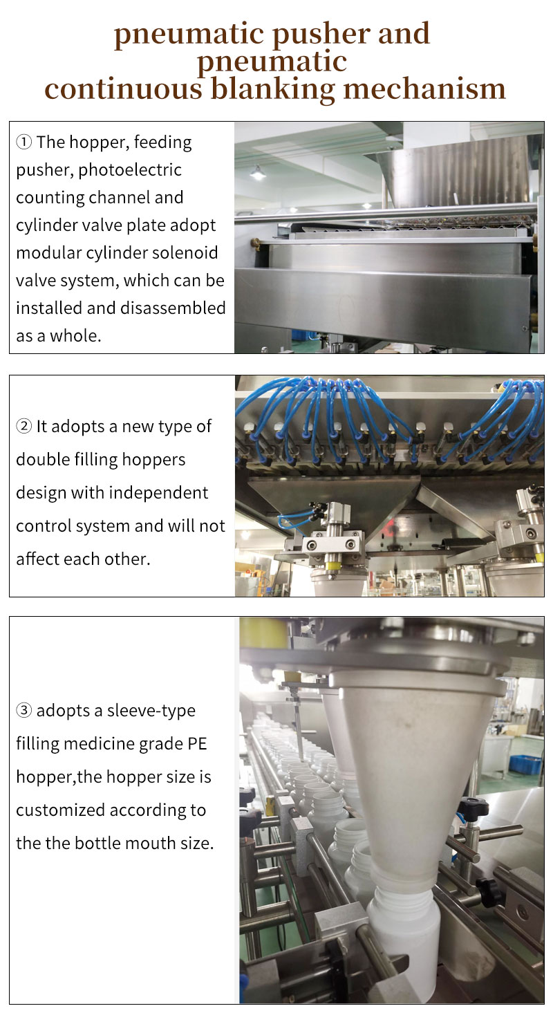 RQ-DSL-16R Intelligent PLC electronic pill food grade tablet counter counting and bottling machine is the sixth generation innovative product of our company. On the basis of the original technology, modular design of the vibrating trough, pneumatic pusher, and pneumatic continuous blanking mechanism. The counting photoelectric adopts one-to-one independent control, which has higher precision, faster speed and more stable operation.It can pack all kinds of tablets and capsules (transparent or opaque hard capsules, soft capsules, pills, etc.) in the range of 3-25 mm.Meet the requirements of GMP, suitable for scientific research institutions, hospitals, small and medium-sized pharmaceutical factories, health products factory production packaging.