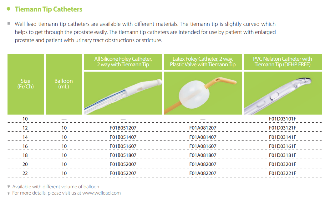 Well lead tiemann tip catheters are available in different materials. The tiemann tip is slightly curved to help ease passage through the prostate. The tiemann tip catheter is intended for use in patients with enlarged prostate and obstructed or narrowed urinary tracts.