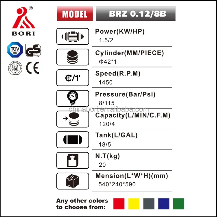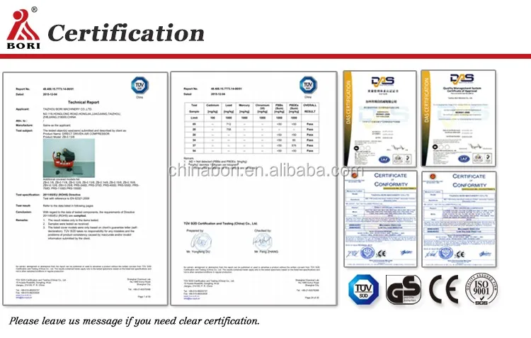 We hold the following certifications:GS, CE, TUV and ISO9001. Our portable compressors are sold in more than 30 countries. If you require special certification, we are happy to provide samples for testing.