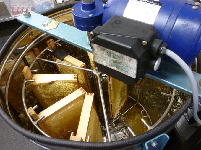 The drum or container holds a rotating frame basket from which the honey is thrown