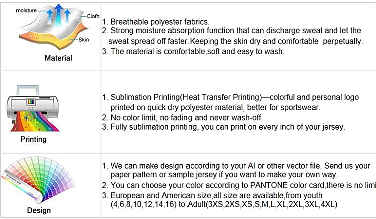 | design | No design or pattern restrictions. Print logo, name on shirt. Just send us your logo or design in PDF or AI format, Or tell us your detailed requirements. Our professional designers will provide you with the best solution. |