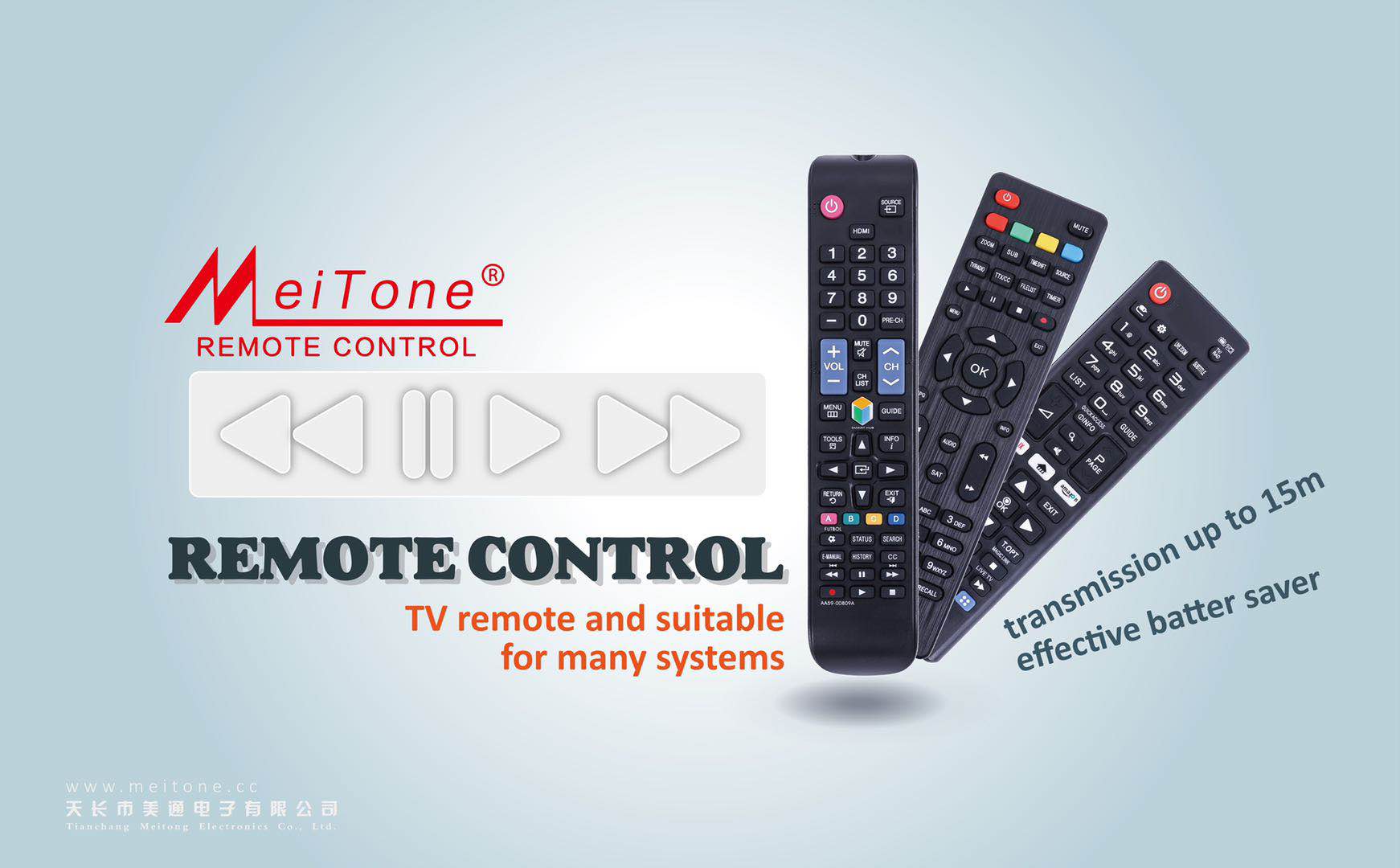 An enterprise under the Meitone Group that focuses on the intelligent design of electronic equipment. Our products have infrared remote control and HV part for more than 10 years, because of insisting on the best management technology, we have been in the leading position of brother companies. Our factory is located in Qinlan Second Industrial Zone, covering an area of 4.5 acres. Close to Shanghai, China. Now we can mass produce remote controls for color TV, VCD, SATELLITE, AUX, DataTVBox, DVB-C, DVB-S, DVB-T, multi-function and universal remotes. And accept OEM orders. 60% of the products are sold to Europe, America, Southeast Asia and the Middle East. "Meitong" is our registered trademark. Here, we always adhere to the concept of "Quality comes from standards, and reputation sticks to it". Our goal is "High quality and low price, going to the world". We hope that friends from all walks of life will show more concern and support in our future career.
