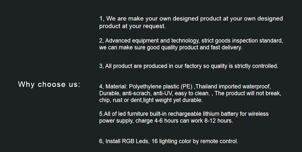 A:We have a wide variety of products, led tables, led chairs/stools/sofa, ice buckets, led lights, bar counters, flower pots, other decorations, ..