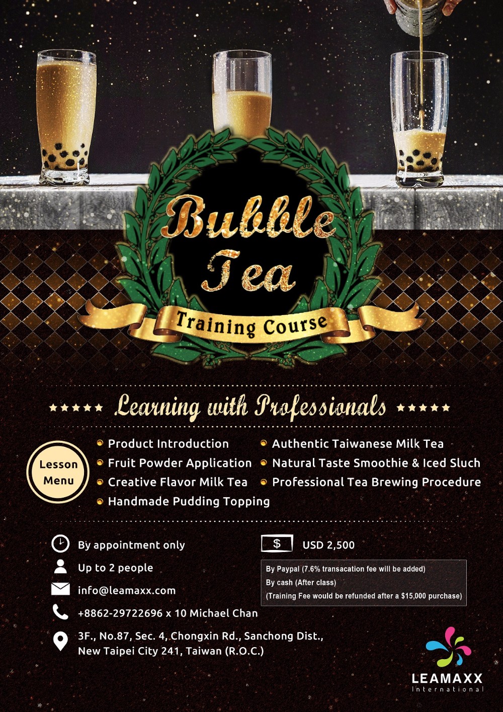 Leamaxx InternationalEstablished in 2006, Taiwan's leading wholesale supplier of bubble tea. Entrepreneurship courses are offered because we believe product training and education are important to the success of business owners. Our goal is to maintain long-term relationships with our business partners and provide them with the tools they need to succeed. We showcase the know-how of the bubble tea business and answer all the questions you may have when starting your own bubble tea business.