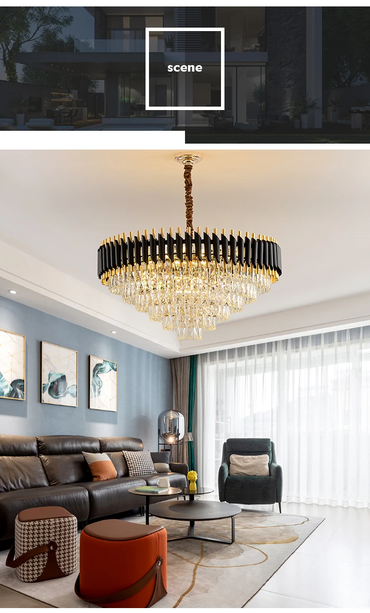 | Color: | Black + champagne gold; | Packaging Detail: | Brown carton + Polyform 2021 round indoor luxury pendant light black gold LED hanging lights home nordic modern k9 crystal chandelier; |