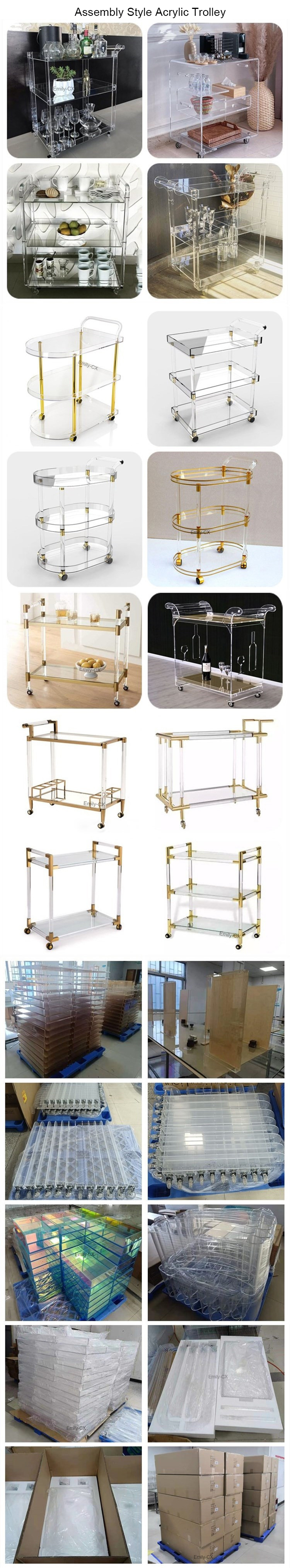 2022 Easy Assemble Hotel Furniture Clear Acrylic Bar Trolley 3 Shelves Rolling Kitchen Food Service Trolley