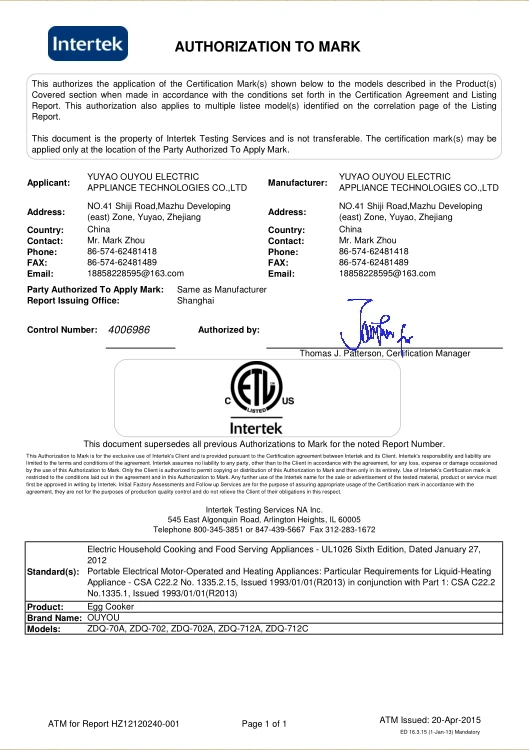 - Ningbo Ouyou Electrical Appliance Technology Co., Ltd.