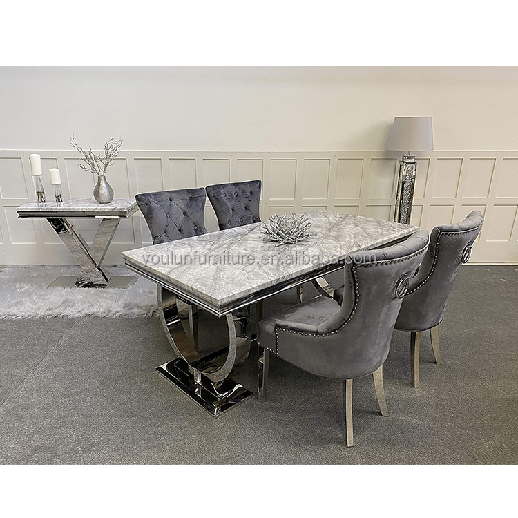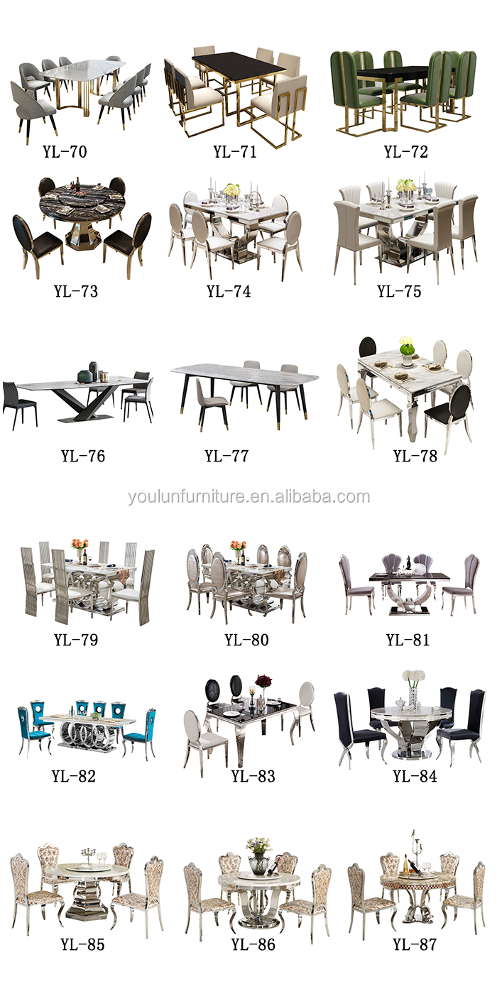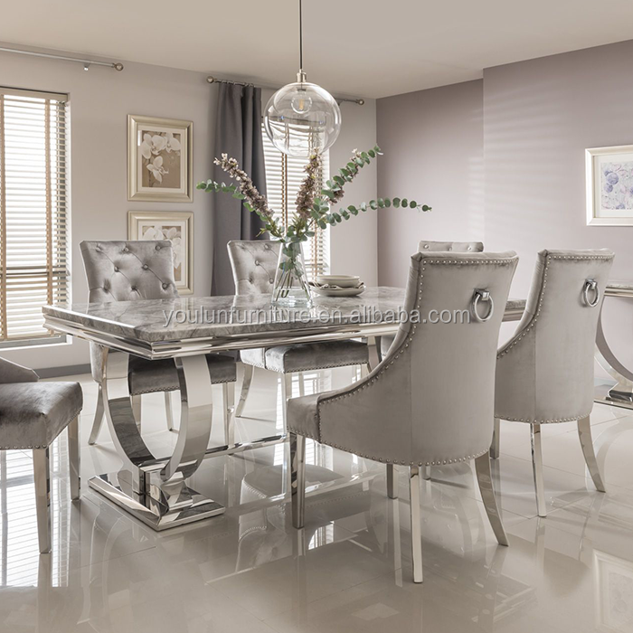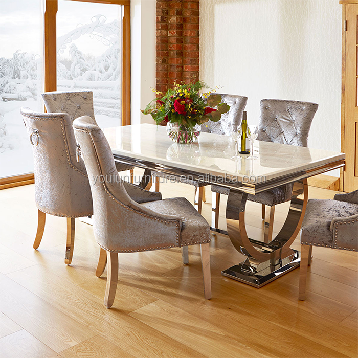 100% natural marble top stone with stainless steel base. Artifical marble top stone and iron base available.The chair can be leather fabric finish both. |