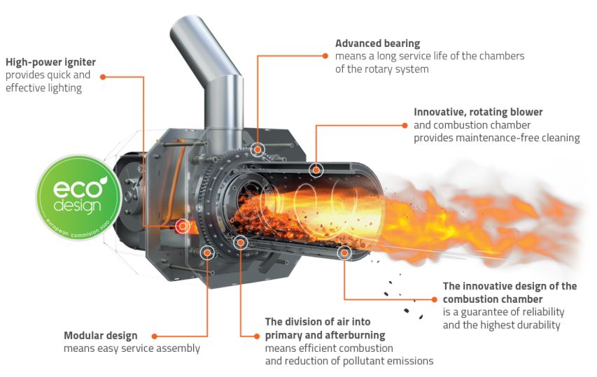 A solution involving a rotating combustion chamber and a blower chamber eliminates all problems due to slag build-up in both compartments. We circulate the furnace through a rotating chamber, during which slag formation and ash build-up occur. This allows continuous removal of combustion products from the combustion and blower chambers without affecting equipment capacity and prevents chamber clogging (often found in other commercially available burners). This means stable and efficient operation of the burner.