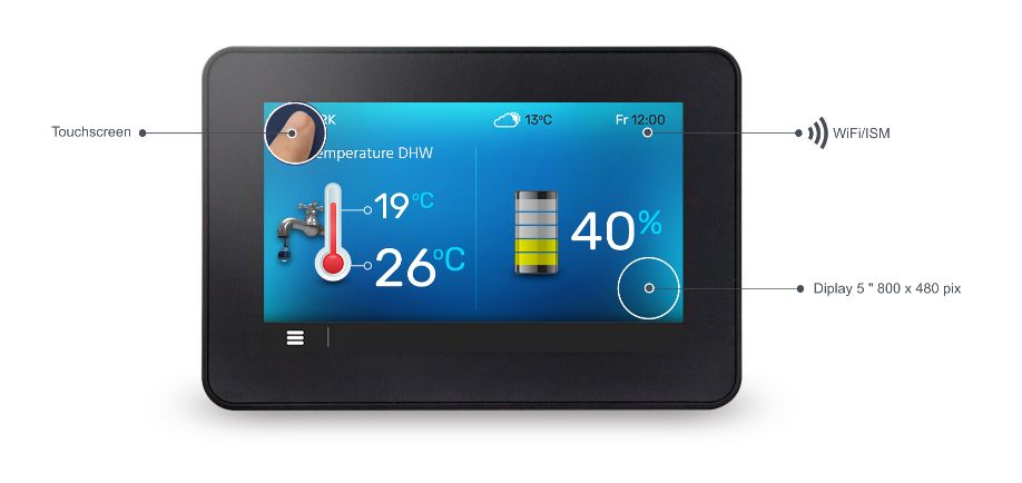 - Has a 5" or 4.3" touch screen that can be mounted on the front of the boiler,