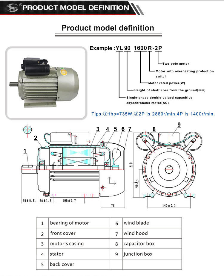 | YL90-750R-2P | 0.75 | 1 | 220v | 50Hz | 2 | 5.1A | 2800 rpm | 16kg |
