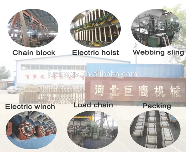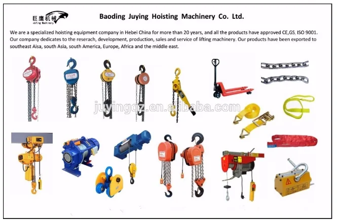 Hebei Juying hoisting machinery co., ltd. Located in Donglv industrial zone with more than 10 years research and producing experience. Our products chain hoist, level hosit,wire rope electric hoist, electric chain hoist, miniature electric hoist, cargo trolley, G80 load chain, webbing sling, round sling, are exported to worldwide.We pay great attention to the quality, quality is the life of our company. Our products has got CE GS certificates, and we will always follow the requirements of ISO9001 standards.Our brand Huge has got the certificates of Hebei famous brand. We also can provide OEM service.We warmly welcome the friends to visit us.