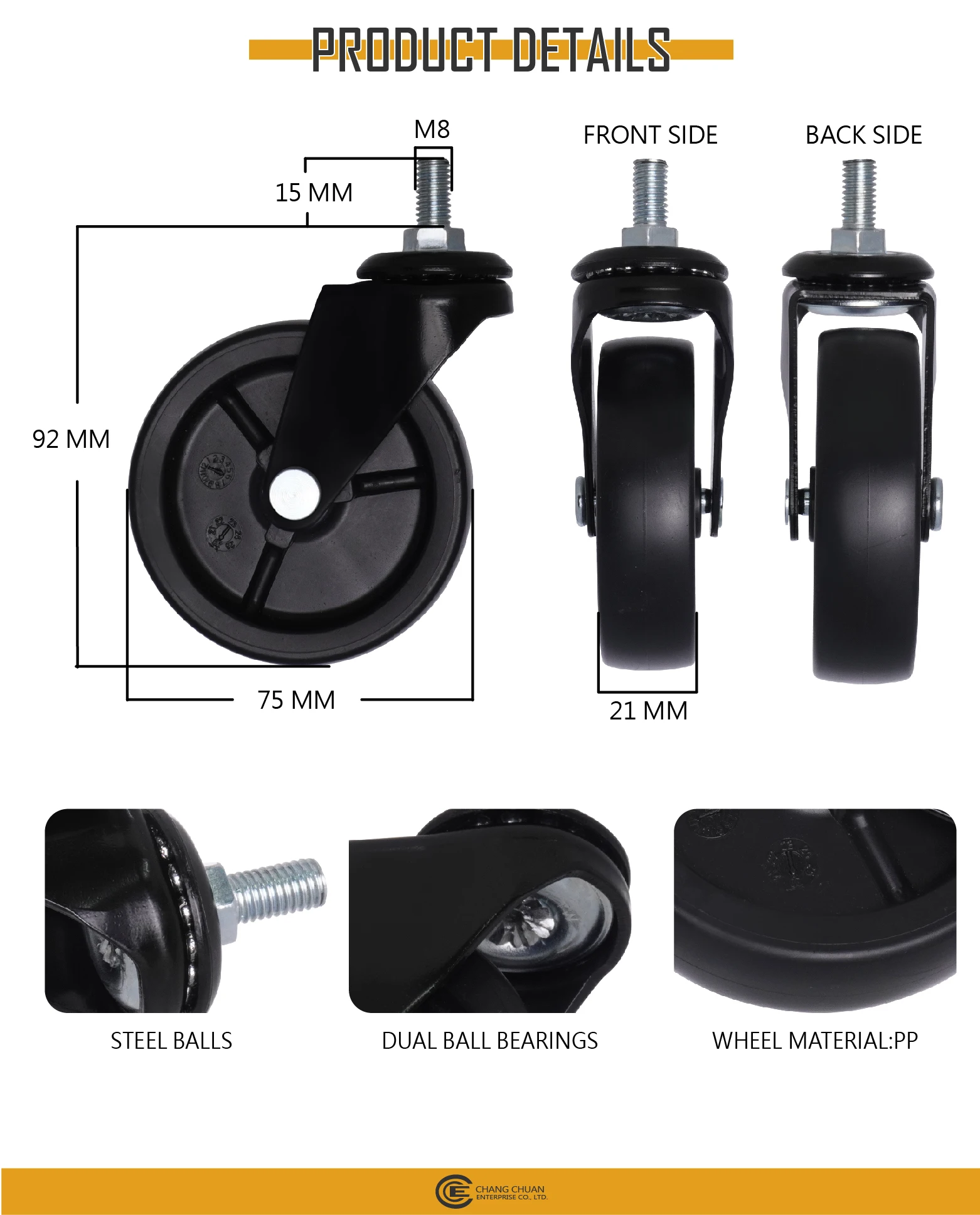 | Model Number: | CT66275; | Product Name: | 3 Inch PP M8 x 15mm Threaded Stem Office Trolley Wheel Swivel Caster; |