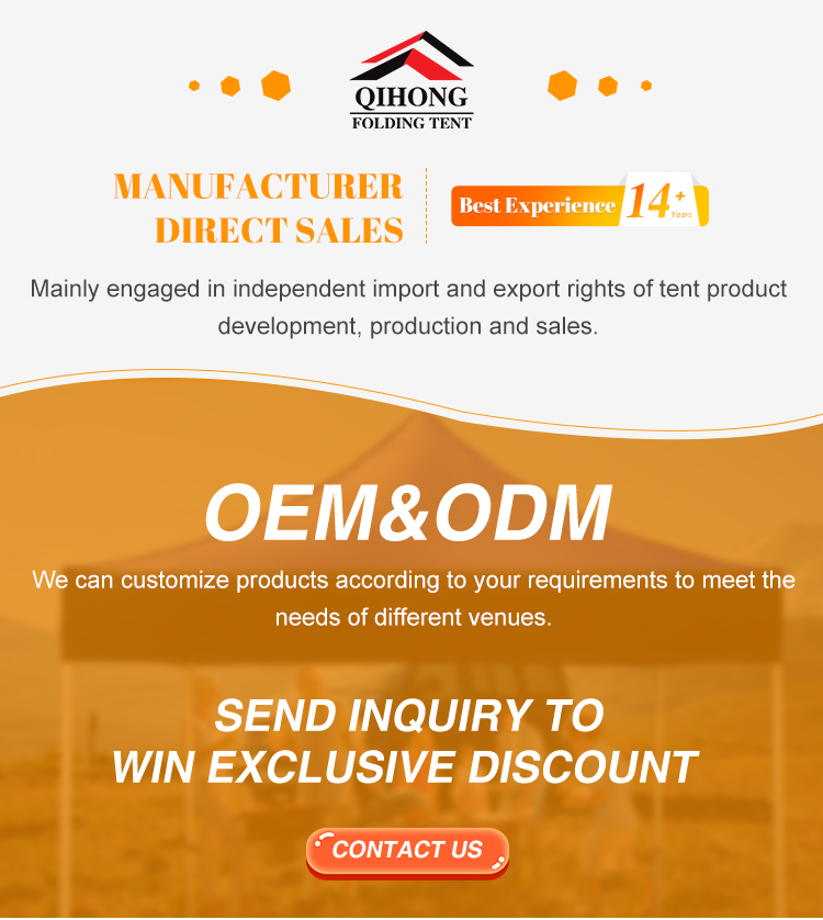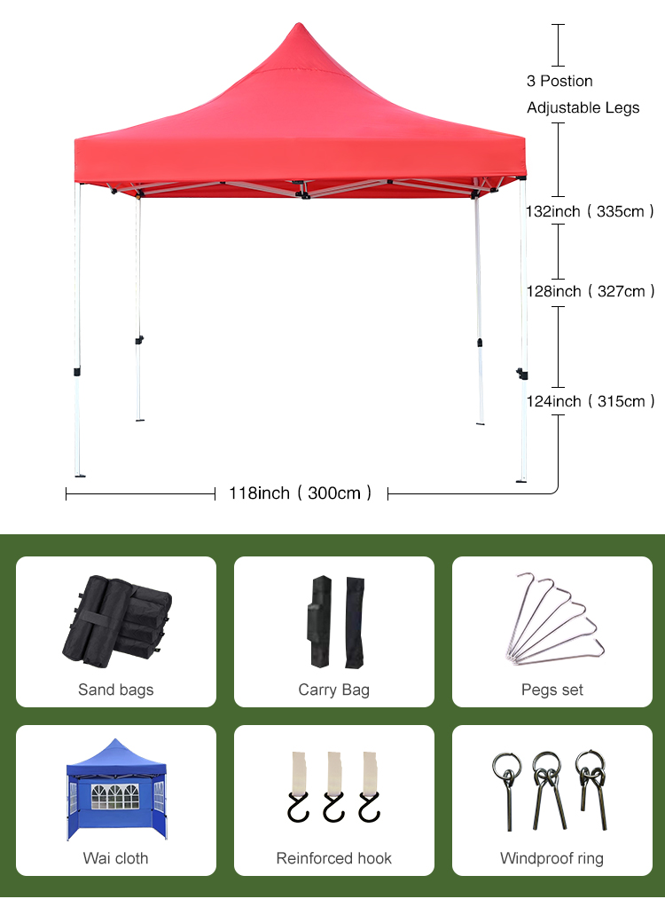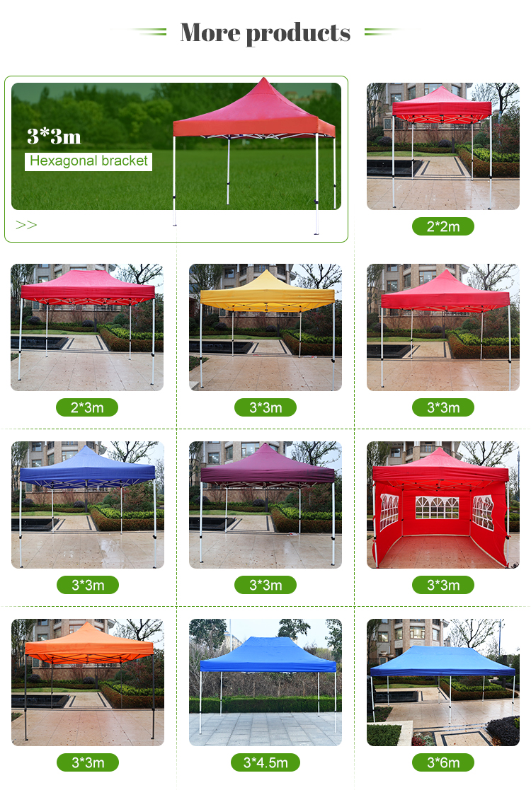 | Tent size: | 2.5mx2.5m(7.5x7.5ft), 3.0mx3.0m(10x10ft), 3.0mx4.5m(10x15ft), 3.0mx6.0m(10x20ft) or customized |