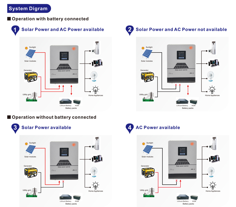 - Configurable AC/solar charger priority via LCD settings
