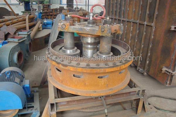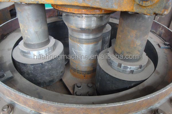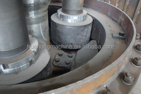 When the material enters the grinding chamber of the main machine, due to the centrifugal force generated by the rotation of the main shaft, the grinding roller swings outward and presses tightly on the grinding ring. The bucket transports the material between the grinding roller and the grinding ring, and as the grinding roller rolls, the material is ground.
