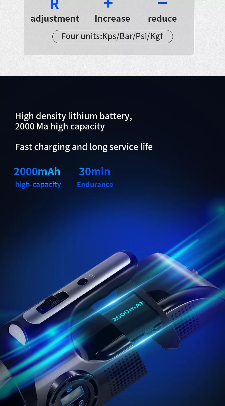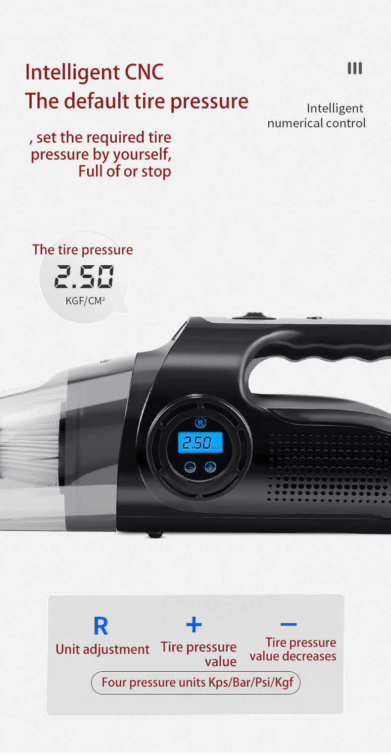 It makes it easier and more convenient to inflate low and flat tires in an emergency. Air compressor pressure gauge display: PSI, BAR, KPA, KGF/CM2.