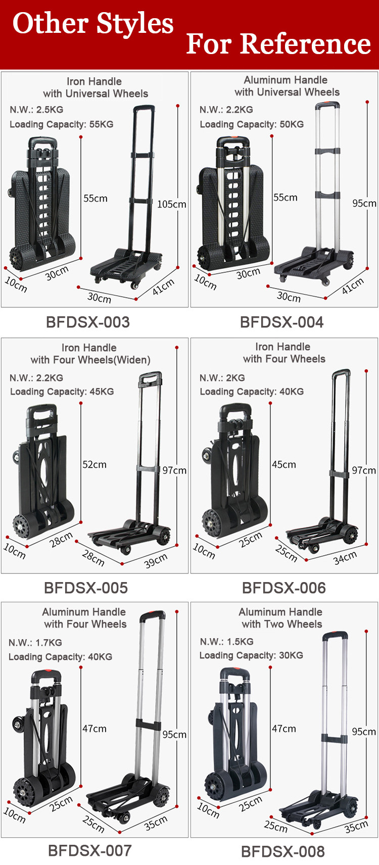 | Packaging Details: | 40KG Loading Folding Portable Folding Trolley Luggage Cart For Shopping Travel Hotels Usually Pack One With Opp Bag And Then 10 Pack In A Carton Carton Size: 46*27*60.5cm Net/Gross Weight: 18/20KG | Gross weight per piece: | 2.000 kg |