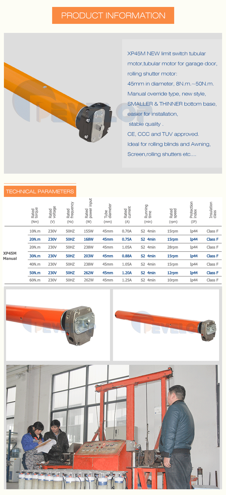 Tubular motor diameter is 45mm, 8Nm~50N.m. manual control type, new type, smaller and thinner chassis, more convenient installation and stable quality. CE, CCC and TUV approved. Perfect for roller blinds and screens, awnings, roller blinds and more.