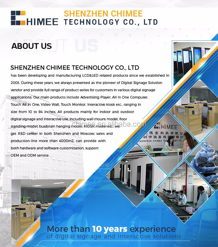 Shenzhen Chimee Technology Co., Ltd. has been developing and manufacturing LCD&LED related products since we established in 2003.During these years.we always presented as the pioneer of Digital Signage Solution vendor and provide full range of product series for customers In various digital signage applications.Our main products include Advertising Player.All In One Computer. Touch All In One,Video Wall,Touch Monitor.Interactive kiosk etc.,ranging in size from 10 to 84 inches.All products mainly for indoor and outdoor digital signage and interactive use.including wall mount model.floor standing model,bus&train hanging model.Kiosk model etc..we get R&D center in both Shenzhen and Moscow.sales and production-line more than 4000m2,can provide with both hardware and software customization.support OEM and ODM service