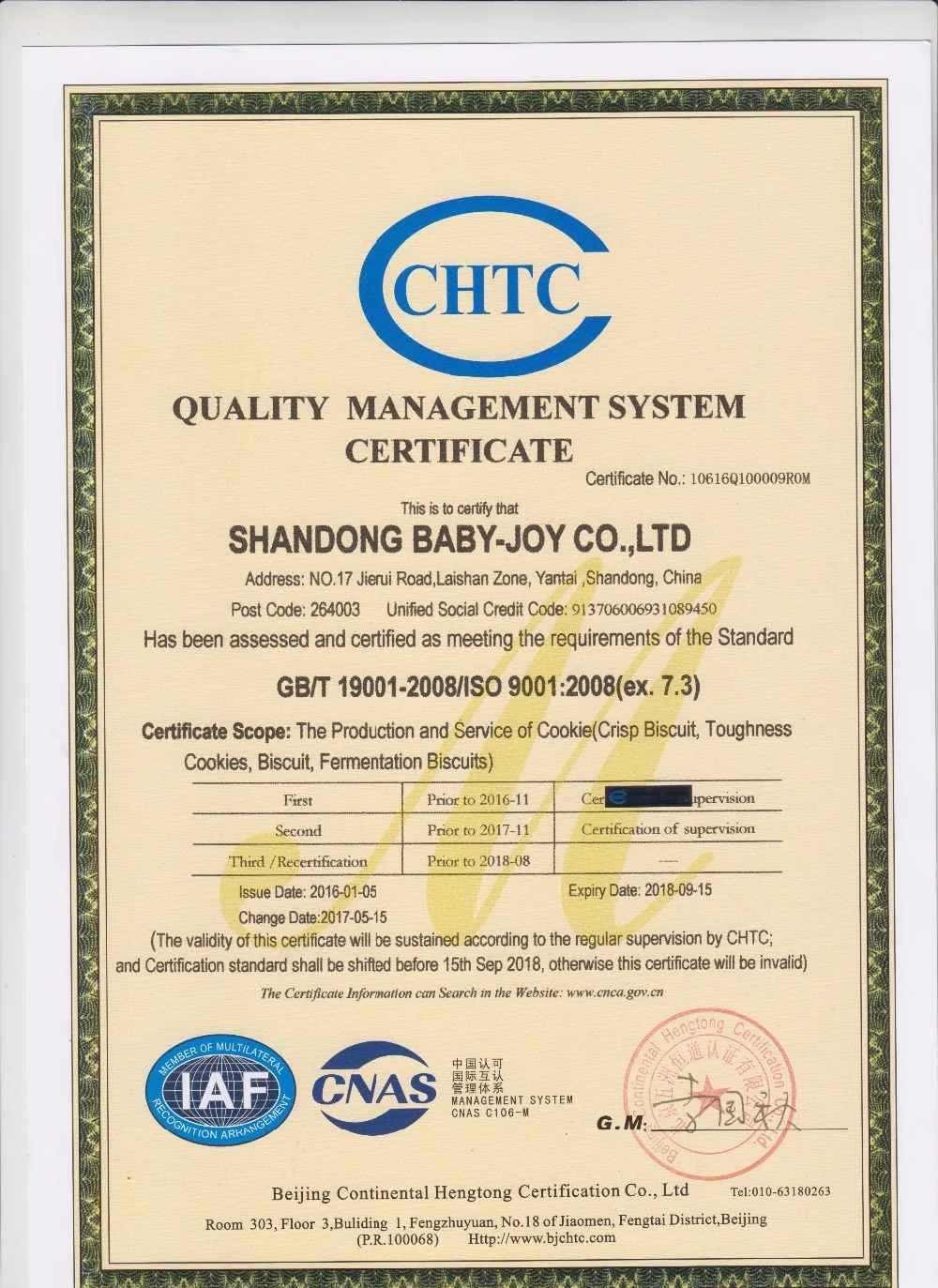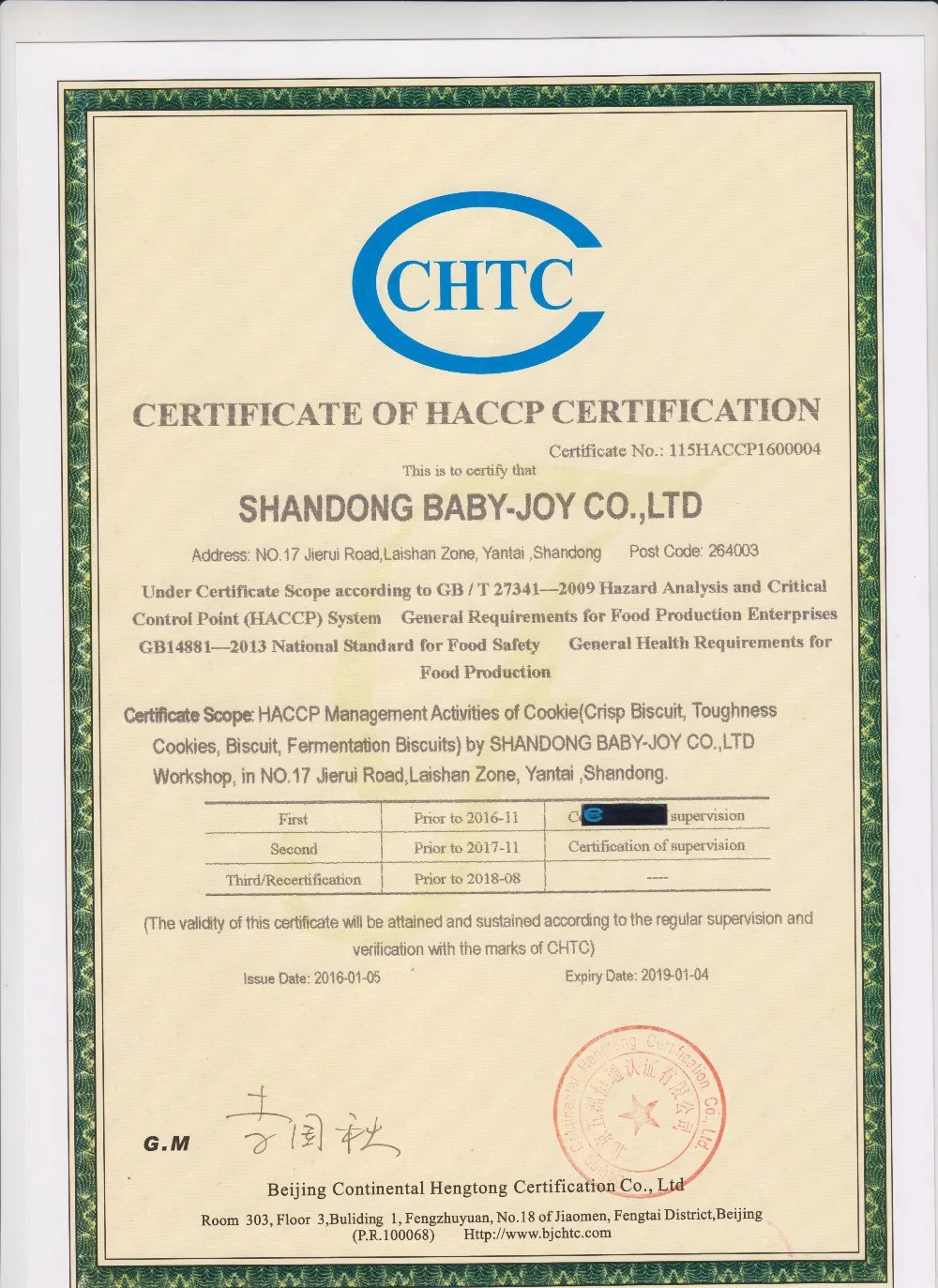 The company is located in Yantai, its main business : development, production and marketing of infant biscuits, pastries and other baked goods, has Yantai, Dezhou, Suzhou three production Parks,obtians ISO9001,HACCP ,organic food certification,products are sold at home and abroad