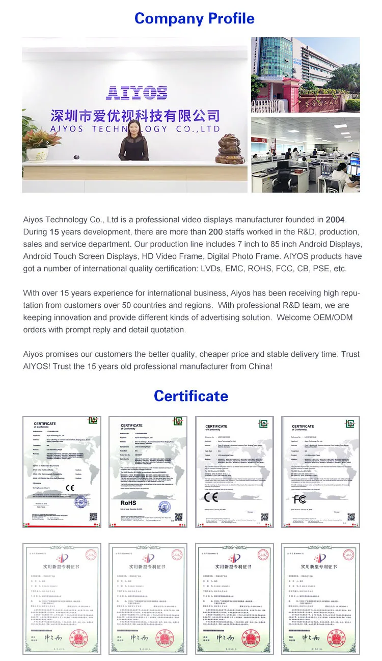 Aiyos has multiple tests from material purchasing to finished products by different departments, like QA, QC, sales representative, to guarantee all signage players are in perfect condition before shipment. We also accept the inspection by the third party you appointed.